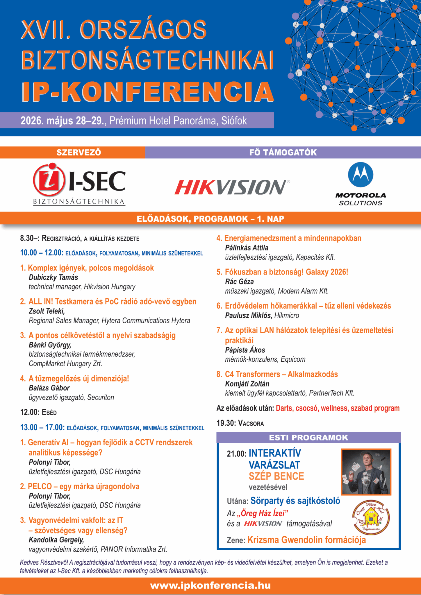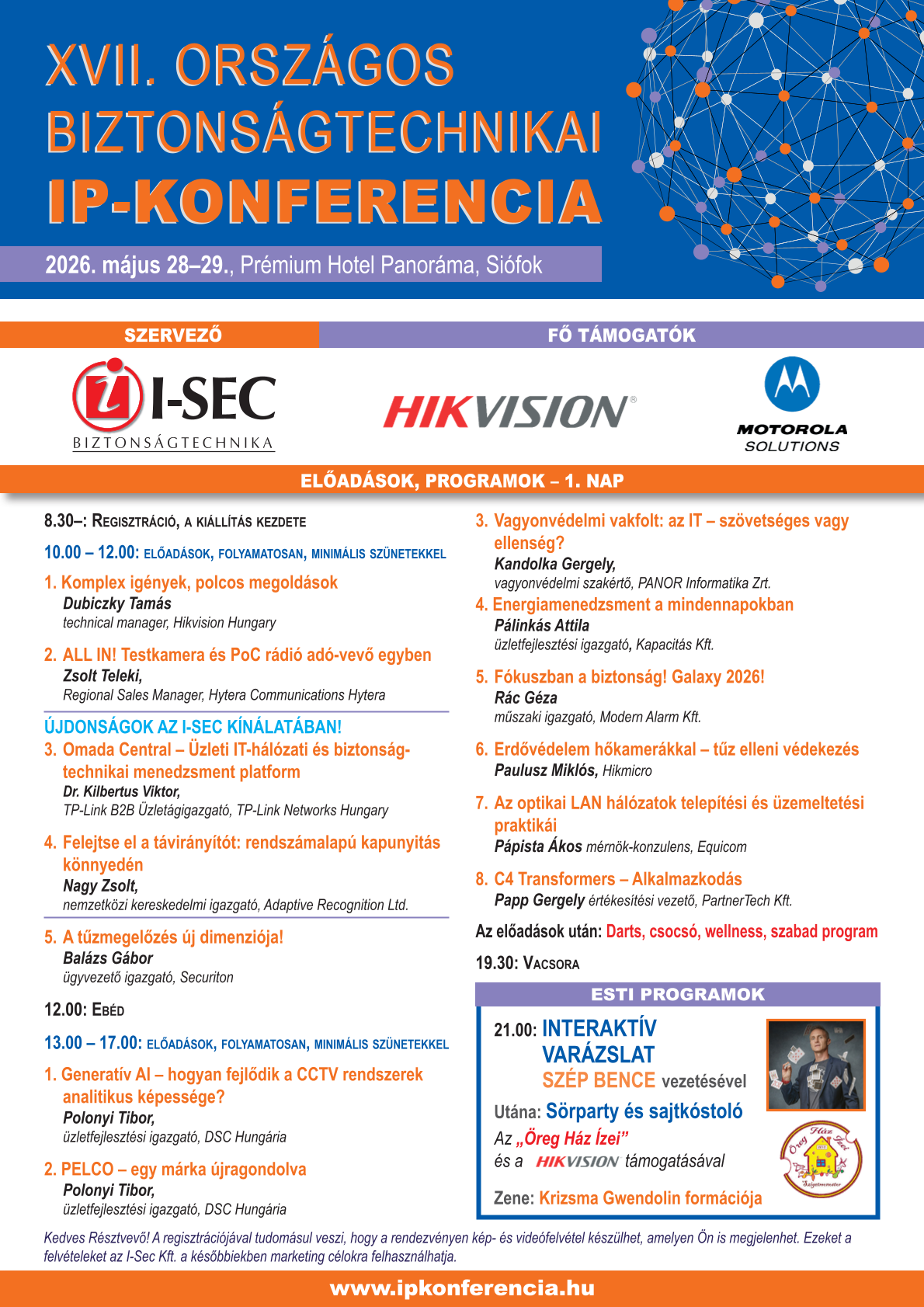 Tisztelt Partnerek Az elmúlt évek tapasztalata alapján (nagyon hamar elfogyott az összes hely) az idén már januárban megnyitottuk a jelentkezési lehetőséget. A XVII. IP biztonságtechnikai Konferencia a szokásos helyen Siófokon és a megszokott időben (május 28-29) kerül megrendezésre.…