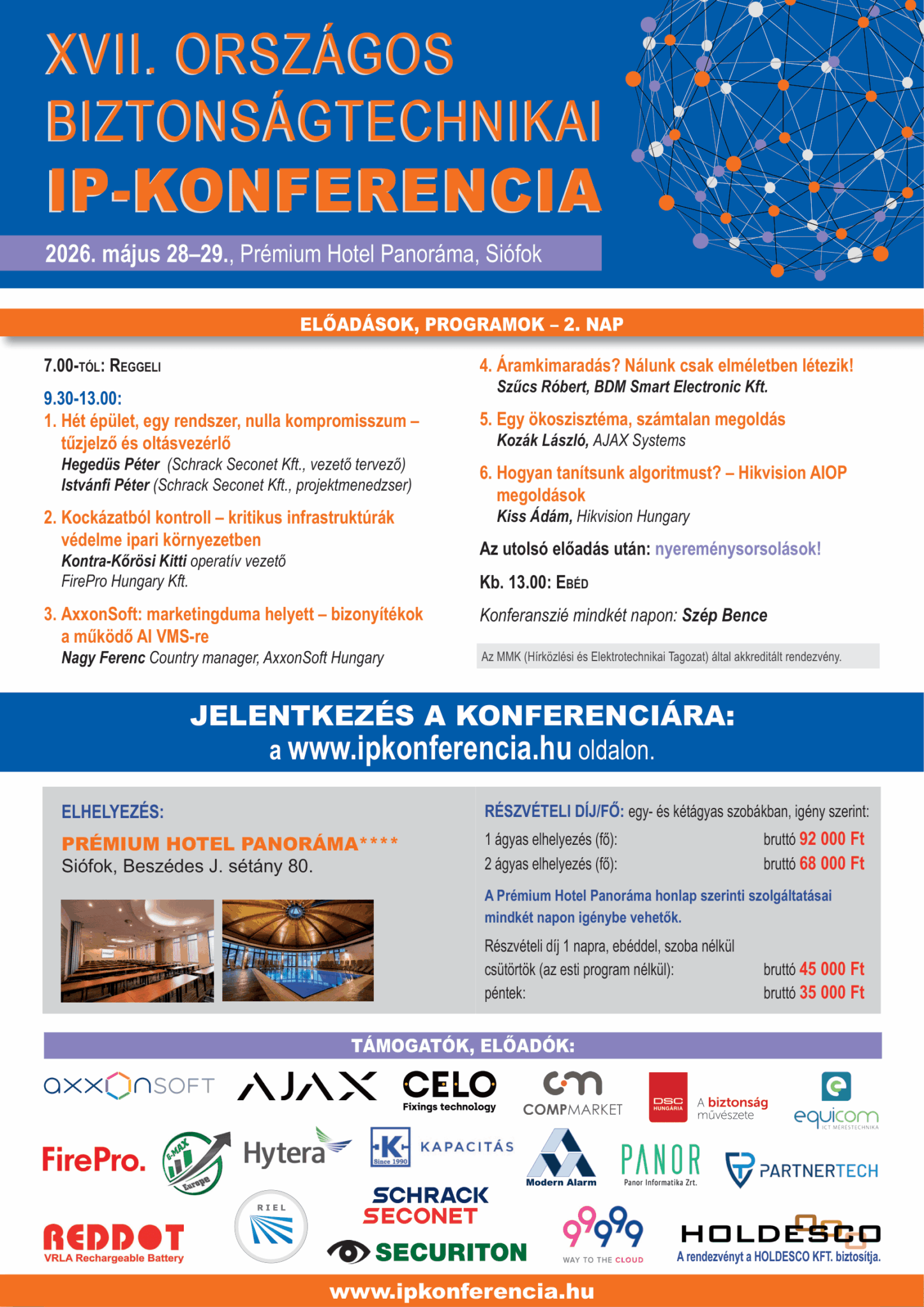 Tisztelt Érdeklődő! május 29-30.-án kerül megrendezésre a XVI. Biztonságtechnikai IP konferencia. Helyszín: Prémium Hotel Panoráma Az előfoglalásokat követően a HOTEL MEGTELT – TELT HÁZ van! A nagy érdeklődés miatt korlátozott számban még fogadunk el jelentkezéseket, szállás a rendezvényhez közeli hotelben lesz.…